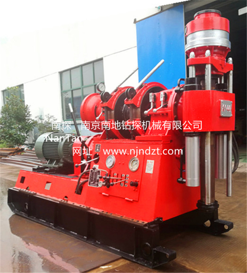 特點:具有較多的轉(zhuǎn)速級數(shù)(8級)和合理的轉(zhuǎn)速范圍,低速扭矩大(最大達(dá)3200牛頓·米),既適合以合金、金剛石巖心鉆進(jìn),也可用于工程地質(zhì)勘察,水文水井鉆進(jìn)和基礎(chǔ)樁工程施工。立軸通孔直徑大(直徑93毫米),雙軸缸液壓給進(jìn),行程較長(可達(dá)600毫米),工藝適應(yīng)性強(qiáng),特別適合大直徑鉆桿繩索取心(上部取心)鉆進(jìn),有利于提高鉆進(jìn)效率和減少孔內(nèi)事故。重量輕,可拆性好,鉆機(jī)凈重2300千克,主機(jī)可分解為10個部件(最大可拆部件重量300千克),搬遷方便,宜于山區(qū)工作。 液壓卡盤采用雙向供油并裝有液壓鎖,卡盤夾持力大,夾持穩(wěn)定。 配有水剎車,深孔鉆進(jìn),下鉆平穩(wěn)安全。采用單聯(lián)齒輪油泵供油,安裝簡單,方便使用,功率消耗少,液壓系統(tǒng)油溫低,工作穩(wěn)定。系統(tǒng)中裝有手搖油泵,當(dāng)動力機(jī)不能工作時仍可用手搖油泵起出孔內(nèi)鉆具。 鉆機(jī)結(jié)構(gòu)緊湊,布局合理,所有部件表露在外,不相互重迭,便于維護(hù)、保養(yǎng)和修理。重心低,移車距離長(可達(dá)460毫米),固定牢靠,高速鉆進(jìn)穩(wěn)定性好。 配有防震儀表,儀表壽命長,利于掌握孔內(nèi)情況。操縱手把較少,操縱靈活可靠。通用化程度高,該機(jī)與XY-4型鉆機(jī)通用件達(dá)60%,與XY-42型鉆機(jī)通用件達(dá)75%。